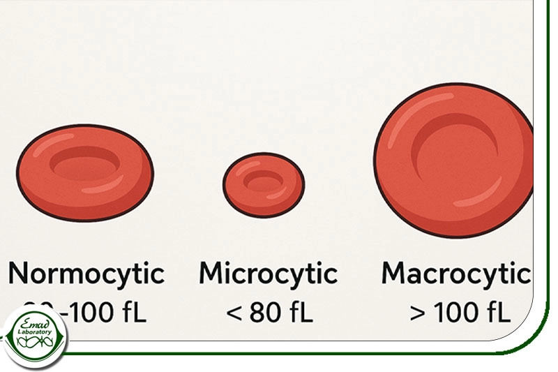 نشان دهنده گلبول های قرمز بزرگتر از حد نرمال است. این حالت می تواند به علت کمبود ویتامین B12 یا فولات، بیماری های کبدی یا اختلالات مغز استخوان ایجاد شود